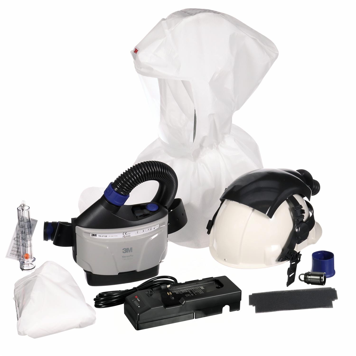 3M™ Versaflo™ Gebläseatemschutz-System TR-302N+, Gebläseatemschutz-System-Kopfteil (S-607), Gebläseatemschutz-System-Filter (TR-3712N), strapazierfähiger, langlebiger Gürtel (TR-326), Hochleistungsbatterie (TR-332N), Luftschlauch (BT-30), Hauben- und Schutzhelmadapter S-Serie S-960 (S-960), Schutzhelm UV Weiß Ratsche (H-701SFR-UV), Gebläseatemschutz-System-Filterabdeckung (TR-371+), Batterie-Ladegerät (Einzelstation) (TR-342N), Vorfilter (TR-3600), Luftstromindikator (TR-971), Gebläseatemschutz-System-Schutzüberzug (TR-381), Aufbewahrungs-Stöpsel (BT-957)