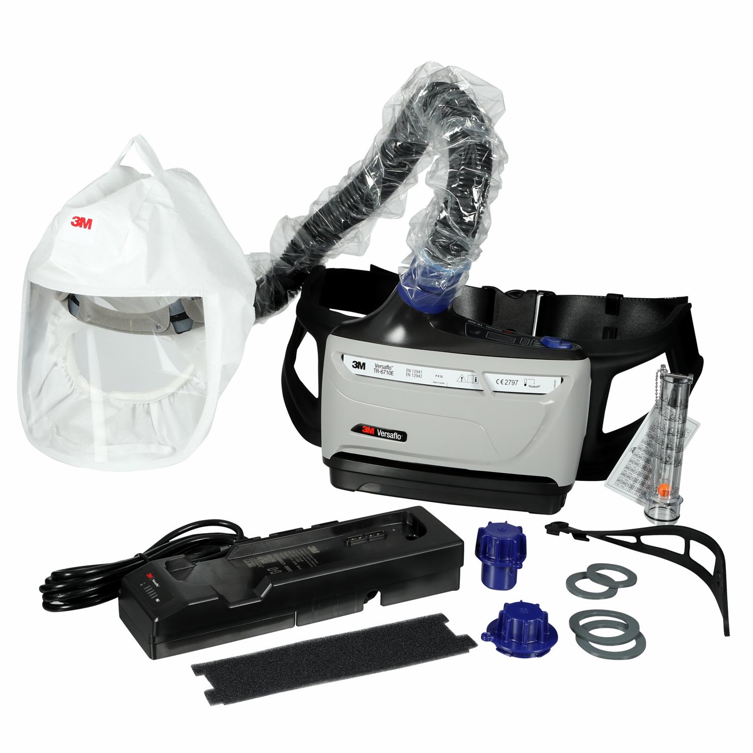 3M™ Versaflo™ Gebläseatemschutz-System (TR-602E), Gebläseatemschutz-System-Kopfteil (S-133L), Gebläseatemschutz-System-Filter-Filter (TR-6710E), Leicht zu reinigender Gürtel (TR-627), Batterie (TR-632), Luftschlauch (BT-30), Gebläseatemschutz-System-Filterabdeckung (TR-6700FC), Batterie-Ladegerät (Einzelstation) (TR-642), Luftstromindikator (TR-971), Reinigungs- und Lagerungskit (TR-653), Aufbewahrungsbeutel (TR-991)