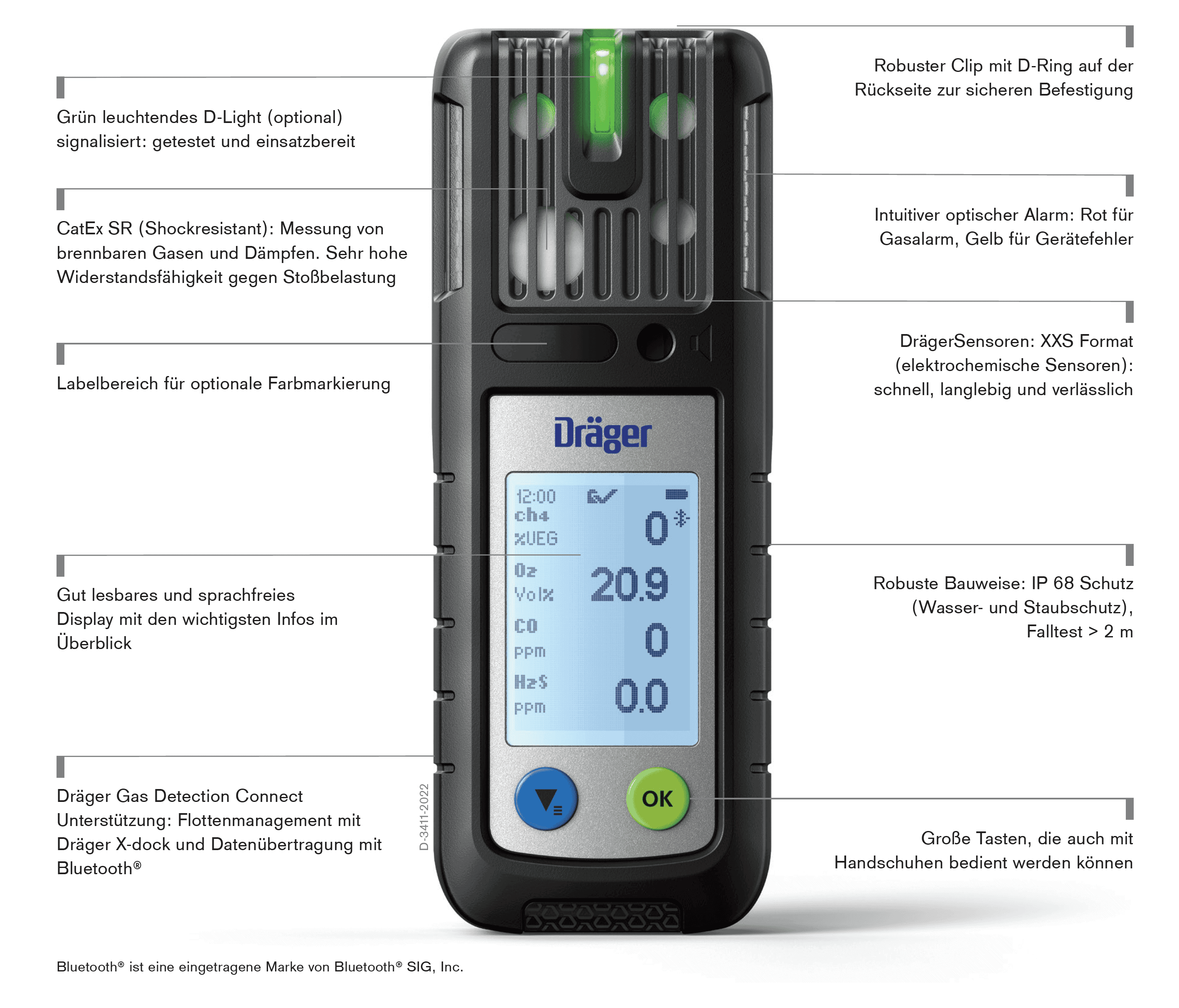 Das gut ablesbare, sprachfreie Display zeigt alle relevanten Informationen übersichtlich an: aktuelle Messwerte, Alarme und Gerätestatus. Große Tasten ermöglichen eine sichere Bedienung auch mit Handschuhen. Ein mehrstufiges Alarmsystem mit optischem, akustischem und Vibrationsalarm sorgt dafür, dass Gefährdungen zuverlässig wahrgenommen werden. Das optionale grün leuchtende D-Light signalisiert auf einen Blick die Einsatzbereitschaft des Geräts.